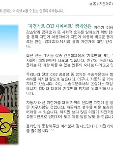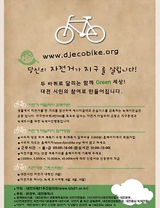 당신의 자전거가 지구를 살립니다~ - 대전, 자전거 마일리지 운동 자전거로 그린스타트 : http://www.djecobike.org/ 대전에서도 드디어 자전거를 이용한 마일리지 운동이 시작 되었습니다. 자전거를 이용해 에너지 절약과 온실가스를 줄이자라는 취지인데 서울에서 시행되고 있는 "자전거로 CO2 다이어트"와 같은 운동 입니다. 자전거로 CO2 다이어트 : http://co2diet.or.kr/ 서울의 경우엔 07년 5월부터 시작하여 이 운동에 동참하는 분들의 총 주행거리가 592,395km나 됩니다. - 더 자세한건 위의 사이트에 접속하셔서 확인 하세요 ^^ 대전의 경우엔 현재 85일째로 총 주행거리가 1,067km로 서울쪽에 비하면 많이 적습니다. 홍보를 이제서야 시작하여(85일째라는데 사이트의 공지는 6월 24일임~!) 현재 8명밖에 참가하는 사람이 없기 .. 2009. 6. 25.